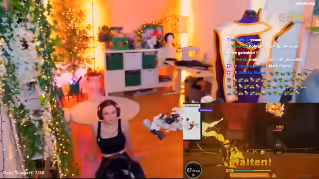 00:21:10Die Streamerin arbeitet intensiv am Cosplay und äußert Bedenken wegen des vielen Goldsprays, das sie verwendet hat. Sie hofft, dass ihre Lunge nicht golden wird und erwähnt, dass sie keine FP2-Masken mehr hat. Es wird befürchtet, Farbe eingeatmet zu haben, da das Gehirn nicht richtig funktioniert. Die Streamerin erzählt, dass sie im Garten gesprüht hat und ihre Oma fast an den Dämpfen geschnüffelt hätte. Es wird überlegt, ob sie als Cosplayer zur Gamescom gehen soll und wie oft sie Gin tragen wird. Die Streamerin sucht nach weiteren Cosplayern für eine Genderband League of Legends Charaktergruppe.