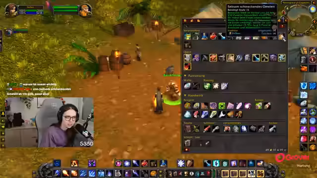 12:16:31Der Fokus verschiebt sich zum Skillen der Kochkunst auf 225 mit Raptor-Fleisch. Dafür muss eine Quest erfüllt und ein neuer Kochkunstlehrer aufgesucht werden. Gleichzeitig wird über die Nutzung von Drachenleder und Wildtierkunde gesprochen, wobei die Mangel an Vorräten ein Problem darstellt. Der Streamer fragt seine Community, ob sie Rieseneier aus Tanaris für eine Quest des Kürschners benötigt, da er selbst über einen Überschuss verfügt.