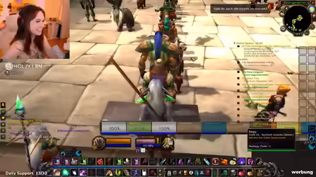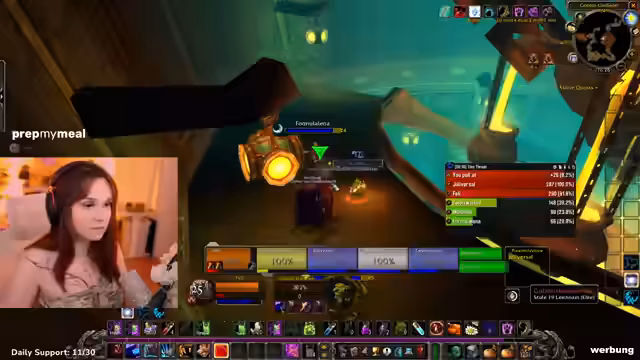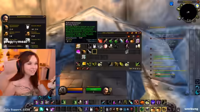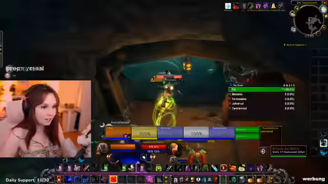 06:29:44Feli, der Tank, zeigt sich angesichts der bevorstehenden Herausforderung nervös. Sie hat Angst vor Fehlern, wie versehentliches Wechseln aus der Bärenform, was katastrophale Folgen haben könnte. Aus diesem Grund schließt sie zusätzlich ihre alte MMO-Maus an, um Panikfehler durch ungewohnte Tastenbelegungen zu minimieren und sich mit der Konfiguration vertraut zu machen, bevor es losgeht.