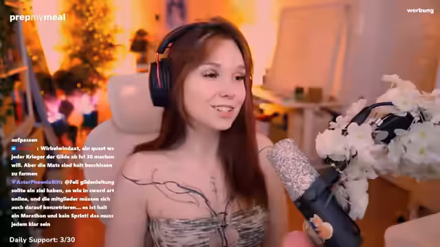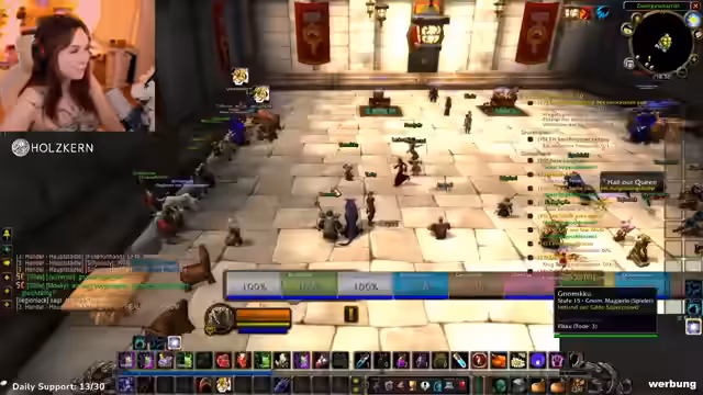 00:11:27Die Streamerin geht auf technische Anpassungen ein, insbesondere den Wechsel von einer MMO-Maus zu einer Razer-Naga-Maus, weil die Tasten für sie besser druckbar sind. Bezüglich des Spiels World of Warcraft Hardcore berichtet sie über ihre persönlichen Erfahrungen und Herausforderungen. Sie gestand, in einer Gruppe mit sehr viel Gesprächsbedarf gewesen zu sein, was zu Kopfschmerzen führte, und habe deswegen länger als geplant bei einer Quest geholfen.