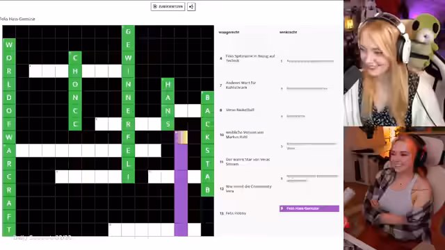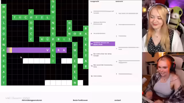 04:48:45Nach technischen Vorbereitungen beginnt das selbst erstellte Kreuzworträtsel, das Feli und Vera gemeinsam lösen. Die Rätselfragen sind vielfältig und reichen von Begriffen wie 'G-Winnerfeli' und 'World of Warcraft' bis hin zu Insider-Witzen. Der Chat wird als Joker und für No-Backseat-Gaming-Regeln eingebunden, um den Spaß für beide Streamer zu erhalten und Fairness zu gewährleisten.