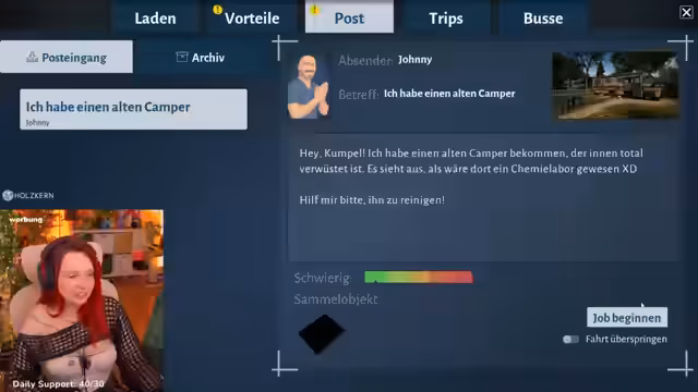 04:55:37Der Stream beginnt mit der Fahrt in einem Schulbus durch eine anspruchsvolle Offroad-Strecke, bei der die Fahrkünfte des Streamers auf die Probe gestellt werden. Anschließend wechselt der Fokus zu dem Spiel 'Busflipper', bei dem es darum geht, einen alten Schulbus in einen gemütlichen Wohnwagen umzuwandeln. Der Prozess des Ausbaus ist sehr detailliert und beinhaltet das Montieren von Möbeln, Verlegen von Böden und das Anschließen von Wasser- und Abflussleitungen. Die Schwierigkeiten beim platzieren von Objekten und das Einhalten von 'Ideal'-Standards für Bonusgeld führen zu frustrierenden, aber auch humorvollen Momenten.
