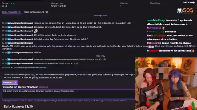 00:25:06Zur Unterhaltung des Chats wird ein interaktives Pack-Opening veranstaltet. Moderatoren und Follower werfen 10 Cent in einen Automaten, um eine Kugel zu drehen, die ein Pack enthält, das dann im Stream geöffnet wird. Gleichzeitig wird das Twitch-Management thematisiert. Die Streamerin findet die Entbannungs-Anträge und ist auf Hilfe angewiesen. Es wird ein Prozess für die Wiederzulassung gebannter User etabliert, bei dem der Streamer und ein Gast die Anträge vorlesen, ein Urteil fällen und der Chat ein Vetorecht hat, um die Gerechtigkeit sicherzustellen.