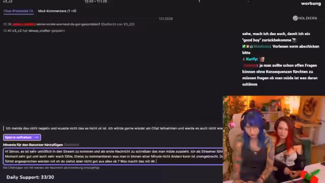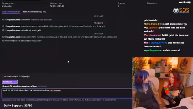 02:05:15Der Stream beschäftigt sich intensiv mit der Freigabe eines gesperrten Chatters. Dabei wird dessen Verhalten als dumm und kindig eingestuft, doch letztendlich wird die Sperre aufgehoben, mit der Maßgabe, dass er sich zukünftig an die Regeln halten muss. Parallel dazu wird ein Dauerproblem mit der Technik thematisiert. Streamer und Co-Streamern berichten von einer seit sieben Jahren genutzten, kaputten Tastatur und einer Maus, deren Mausrad nicht mehr funktioniert, was die Produktion massiv beeinträchtigt und zu frustrierenden Situationen führt.