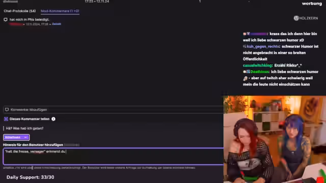 01:59:01Die Grenzen von Humor im Stream werden thematisiert. Schwarzer Humor ist nicht erlaubt, da er bei Zuschauern zu Missverständnissen und Angriffen führen kann. Ein Nutzer, der ein Wortspiel mit dem Begriff der Fresse verwendet, wird aufgefordert, sich zu entschuldigen. Es wird betont, dass respektloser Humor, der andere verletzt, nicht toleriert wird und zu Konsequenzen wie einem Bann führen kann.