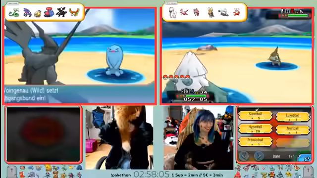 09:14:54Die Streamerin diskutiert über den Fang eines Legi-Pokémons, wobei sie unsicher ist, ob sie ihren珍贵en Meisterball dafür einsetzen soll. Sie erhält Ratschläge aus dem Chat, die darauf hindeuten, dass das Pokémon noch weiterentwickeln könnte. Sie wirft schließlich einen Meisterball, der jedoch scheitert, und beschließt, stattdessen einen Hyperball zu verwenden, was erfolgreicher ist. Parallel dazu wird eine Missverständnis bei den Einlösepunkten für ein Pokémon namens Malekete geklärt, bei dem ein Zuschauer Cello einen Refund erhält, um es erneut zu versuchen.