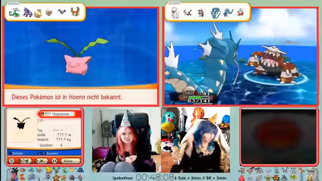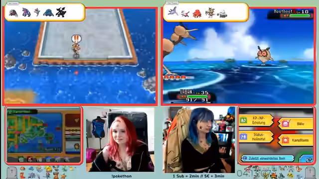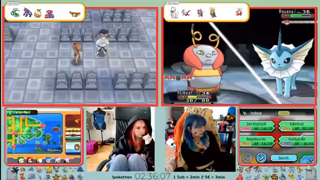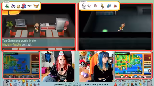 03:14:42Nach der demoralisierenden Niederlage kehrt der Streamer ins Pokémon Center zurück, um sein Team neu zu strukturieren und die freien Slots zu besetzen. Man entscheidet, Ruhe, Noctur und Botogel mitzunehmen. Ein großes Problem ist, dass kein Teammitdie Surfer-Fähigkeit besitzt, was zwingend ist, um das aktuelle Gebiet zu erkunden. Man plant daher, kurz einen VM-Sklaven wie Molly einzusetzen, die jedoch im Kampf gegen ein starkes Aquana stirbt.