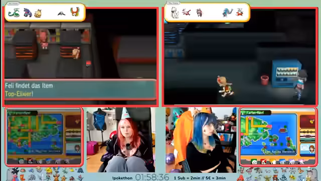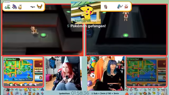 06:55:36Nach einer Pause wegen des Kuchens wird das Pokémon-Spiel fortgesetzt. Das Team navigiert durch eine Tiefseehöhle und begegnt Team Magma. Die Streamerin kämpft mit verschiedenen Pokémon, darunter Treppe und Kathi, und muss sich strategisch durch Herausforderungen kämpfen. Es kommt zu spannenden Kämpfen, in denen die Effektivität von Attacken diskutiert wird und das Team einige Verluste hinnehmen muss.
