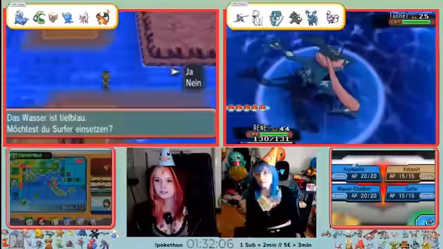 02:22:35Nachdem Hanzo gefangen wurde, wird das neue Team zusammengestellt. Es wird diskutiert, welches Pokémon surfen kann, da dies für den Fortschritt im Spiel notwendig ist. Es stellt sich heraus, dass Hanzo nicht surfen kann. Feli muss also entscheiden, ob sie die Route zu einer Stadt nutzt, um ein neues Teammitglied zu finden, oder ob sie den Rest des Teams durch die Safari-Zone führt und dabei hofft, keine weiteren Pokémon zu verlieren.