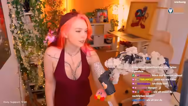 03:26:43Der Streamer unterhält sich über alltägliche Situationen, wie das Führen von Tickets in der Straßenbahn und die Seltenkeit von Kontrollen in Köln, wobei sie ihre freche Haltung betont. Im weiteren Verlauf spricht sie über die fehlende Hälfte ihres Make-ups und den Wunsch, es neu aufzutragen. Dabei erwähnt sie auch ihre neue Haarfarbe, eine Mischung aus Pink und Pfirsich, die sie trotz des nicht ganz erwarteten Ergebnisses mit einer entspannten Haltung 'just hair' betrachtet, da Haare nachwachsen und sie nur das an ihrem Aussehen gefällt.