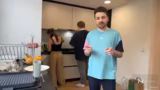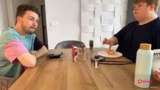 00:40:20Trotz der anfänglichen Probleme gelingt es, einige gelungene Pancakes herzustellen. Diese werden mit verschiedenen Zutaten wie Apfelscheiben, Nutella und Zimt verfeinert. Während des gemeinsamen Essens entwickeln sich persönliche Gespräche. So wird über die Schwierigkeiten mit der Bankkarte gesprochen und die Freunde diskutieren über Abitur-Noten und Alltagsleben. Eine Störung verursacht der Hund Torben, der ungeduldig auf seine Mahlzeit wartet und unerwünscht in die Küche kommt, was für zusätzliche komische Momente sorgt.