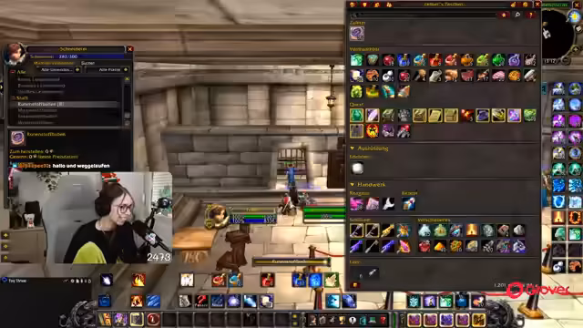 02:56:42Zunächst stehen das Inventarmanagement und der Fortschritt der Berufe im Fokus. Die Streamerin stellt fest, dass ihr Bankfach überfüllt ist, aber sie dennoch einige Materialien wie Ruhestoff und Runenstoff in Ordnung hat. Diese stammen aus einem Handel mit einem Zuschauer namens SAFJ, den sie scheinbar vergessen hatte. Dies ist eine positive Entwicklung, da sie nun ihre Berufe wie Schneiderei und Runenschmiedecraften kann und dazu die Materialien verarbeitet.