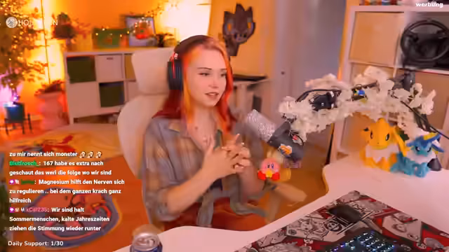 00:38:50Es wird über psychische Probleme und den Herbst-Blues gesprochen. Die Streamerin empfiehlt die Einnahme von Vitamin D zur Stimmungsaufhellung. Ein Zuschauer berichtet von Stress und Problemen in verschiedenen Lebensbereichen. Die Streamerin ermutigt ihn, auf seine mentale Gesundheit zu achten und sich Zeit für sich selbst zu nehmen. Es wird über die Spontanität des Streamplans diskutiert. Ein Zuschauer fragt nach den Ringen der Streamerin. Sie erklärt, dass ein Ring ein selbstgegossener Freundschaftsring ist und die anderen von Holzkern sind. Es wird über den Konsum von Monster Energy und den Unterschied zwischen zuckerhaltigen und zuckerfreien Varianten gesprochen. Die Streamerin äußert ihre Abneigung gegen den Herbst und Winter, wobei ihr Geburtstag das einzig Positive am Herbst sei. Ein Zuschauer mag den Winter und die Gemütlichkeit, während die Streamerin das regnerische Wetter ablehnt.