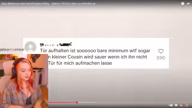 01:52:05Es wird über die Frage diskutiert, was in einer Beziehung als normal gilt und welche Erwartungen angemessen sind. Ein TikTok-Video wird thematisiert, in dem ein Mann über seine traumatische Kaiserschnittgeburt spricht und wie diese ihn dazu brachte, Frauen gut behandeln zu müssen. Die Streamerin distanziert sich von diesem Video und betont, dass Frauen von Grund auf gut behandelt werden sollten. Es wird ein weiteres TikTok-Video analysiert, in dem ein Paar fragwürdige Beziehungsregeln aufstellt, was zu Irritationen führt. Die Regeln wirken eher wie ein Kontrollverhältnis als auf Kommunikation basierend. Es wird die Frage aufgeworfen, ob es fremdgehen ist, wenn man sich von einer Person des anderen Geschlechts massieren oder behandeln lässt. Die Bedeutung von Vertrauen in einer Beziehung wird hervorgehoben und die Ablehnung von Kontrollmechanismen betont.