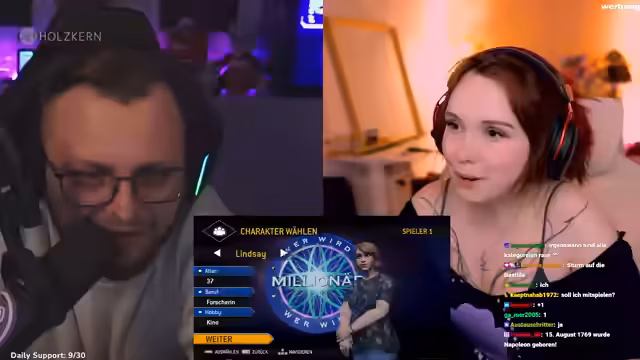 03:29:26Gegen Ende des Streams startet eine spielerische Kooperation mit einem anderen Streamer. Sie spielen gemeinsam das Spiel 'Wer wird Millionär?' und planen, im ersten Durchgang direkt die Million zu gewinnen. Vorher wird die technische Einrichtung des Multistreams via Ninja beschrieben, um das gemeinsame Gameplay zu ermöglichen. Die Vorbereitung für das Spiel umfasst die Kategorienauswahl und die Charakterwahl.