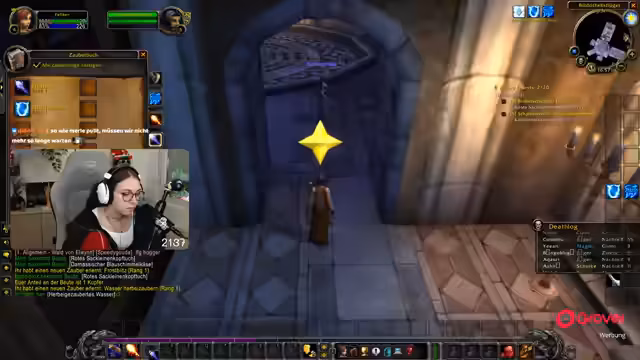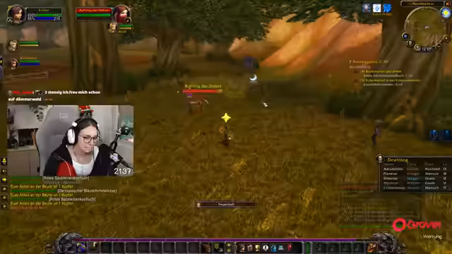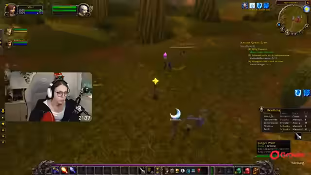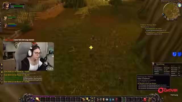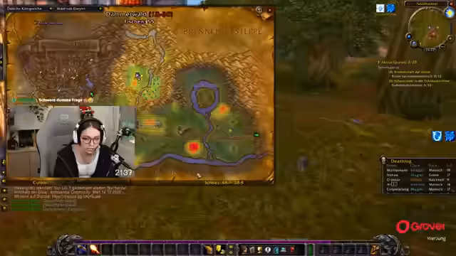 02:04:10Quests wie 'Koboldtagelöhner' und 'Säuberung des Koboldlagers' werden in Gruppen erledigt. Merle erklärt, dass Questziele auf der Minimap als Schwerter markiert sind und man abwechselnd lootet. Das Inventar füllt sich schnell, daher werden überflüssige Items verkauft. Die Spieler betonen die Suchtgefahr durch ständigen Quest-Loop und danken Spendern für Taschen und Tränke. Die Zeit vergeht schnell durch occupierendes Gameplay, wobei der Fokus auf Leveln und Erfüllung von Quest-Ketten liegt.