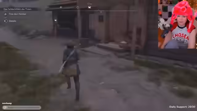 04:21:59Die Streamerin verfolgt verschiedene Quests und wählt zunächst die von Naue aus. Sie analysiert die Quest-Tafeln und verfolgt den Weg des maskierten Mannes. Sie rekrutiert Dan und Montab als Speer. Die Streamerin befreit einen Aussenposten. Die Streamerin reitet durch die Landschaft und kommentiert, wie schön es dort aussieht. Sie fliegt im September wieder nach Japan. Sie befreit einen Bauern, der von Räubern bedroht wird und erhält Spitzel-Informationen als Belohnung. Sie entdeckt Osaka Castle, an dem sie vor zwei Jahren vorbeigelaufen ist und plündert Verpflegung, ohne dass es jemand bemerkt. Sie erreicht einen Stufenaufstieg und vermutet, dass Osaka Castle noch über ihren Kräften liegt.