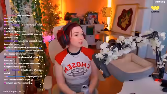01:20:14Der Kater Chonk wird thematisiert, der sich nicht in sein Körbchen legen will, was als 'schwere Geburt' bezeichnet wird. Sein Hintern wird scherzhaft als Greenscreen-tauglich dargestellt, um Spiele darauf zu spielen. Es wird festgestellt, dass Chonk 8 Kilo wiegt. Die Streamerin schildert, wie Chonk auf ihr Essen geiert und gibt ihm Snackies als Belohnung, als er sich ins Körbchen legt. Sie bittet ihn, sich zu entspannen und hinzulegen. Es wird überlegt, ob Chonk für das Amt des Bundespräsidenten kandidieren könnte, wobei die Frage aufkommt, ob der Bundespräsident menschlich sein muss. Es wird festgestellt, dass der Bundespräsident deutscher Staatsbürger sein muss, was auf Tiere nicht zutrifft.