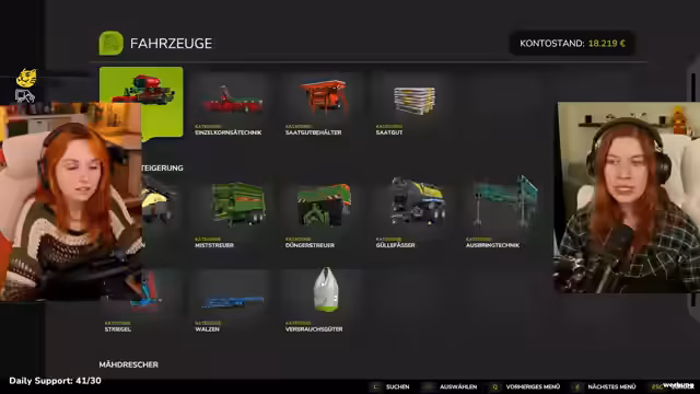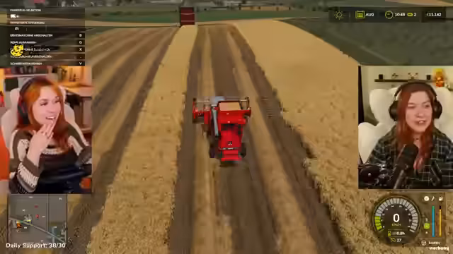02:21:49Nachdem die Felder gesichert sind, konzentriert sich die Streamerin auf die Anschaffung notwendiger Landmaschinen. Es wird ein reduzierter Trecker gekauft, der als guter Anfang gilt. Da für die Weizenernte ein Mähdrescher unerlässlich ist, wird dieser für 5000 Euro gemietet, da der Kaufpreiz zu hoch wäre. Zusätzlich wird ein Anhänger für 6000 Euro gekauft, um die Ernteprodukte transportieren zu können und zukünftige Mietkosten zu sparen.