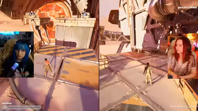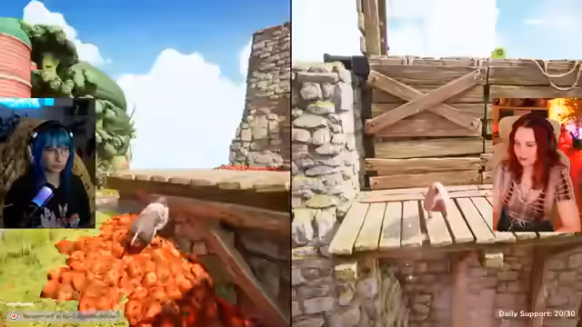 05:42:03Die Streamer spielen ein Timing-Minispiel und haben Schwierigkeiten damit. Eine Person wird fast zertrampelt und fällt herunter. Sie geben sich gegenseitig Tipps und schaffen es schließlich. Sie kapern ein Schiff und fliehen, wobei eine Person fliegt und die andere schießt. Es gibt Probleme mit der Steuerung. Sie schaffen es knapp und gelangen in eine entspanntere Mittelalter-Welt mit einem schönen Dorf. Sie tragen Ritterrüstungen und finden die Welt netter als ballernde Raumschiffe. Es wird jedoch die Gefahr von Drachen erwähnt. Sie müssen vor Trollen wegrennen und haben Probleme mit der invertierten Steuerung. Sie bevorzugen es, von einem Laser getroffen zu werden, als von einem Katapult. Die Steuerung kann umgekehrt werden, aber sie hatten bisher keine Lust dazu.