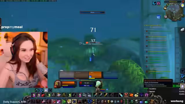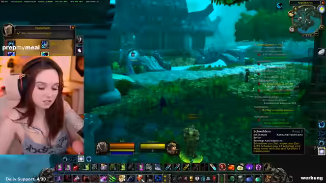 07:12:27Der Stream beginnt mit der Diskussion über den Einsatz von Feenfeuer im Spiel, sowohl zum Pullen als auch zum Taggen von Mobs. Es werden die niedrigen Level der Charaktere erwähnt, was die Teilnahme an Raids unwahrscheinlich macht. Neben dem Gaming spricht die Streamerin über reale Verpflichtungen wie eine D&D-Kampagne, Einkaufen und Kochen, wobei sie ihre persönliche Abneigung gegen Kochen deutlich macht. Ein wichtiges im Stream etabliertes System ist das Buff-Management. Ein Murloc-Sound dient als Erinnerungshilfe; bei dessen Erhalt geben die Zuschauer im Chat ein Ausrufezeichen, woraufhin die Streamerneu Buffs vergeben, um nichts zu vergessen.