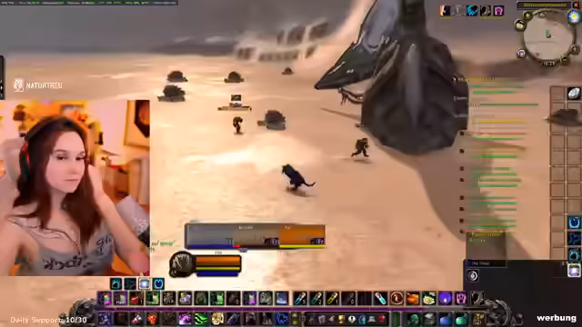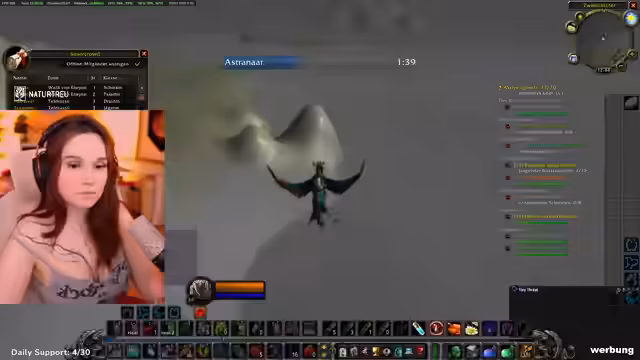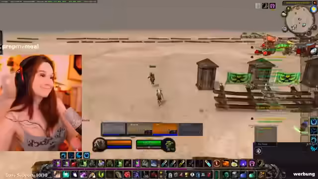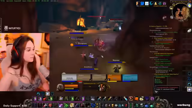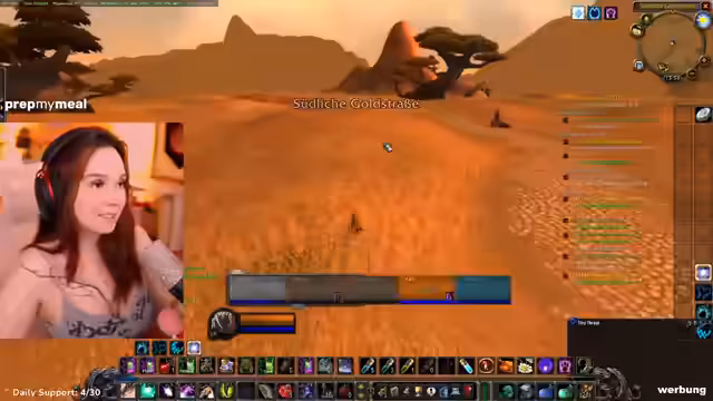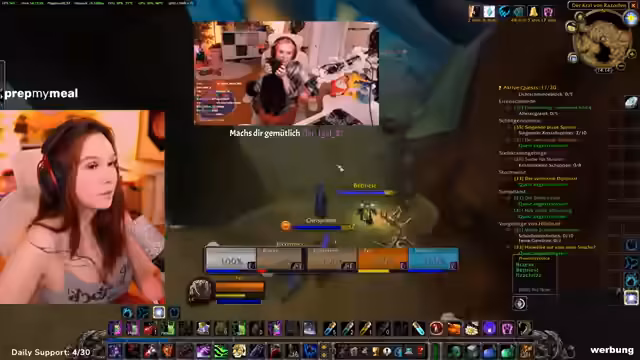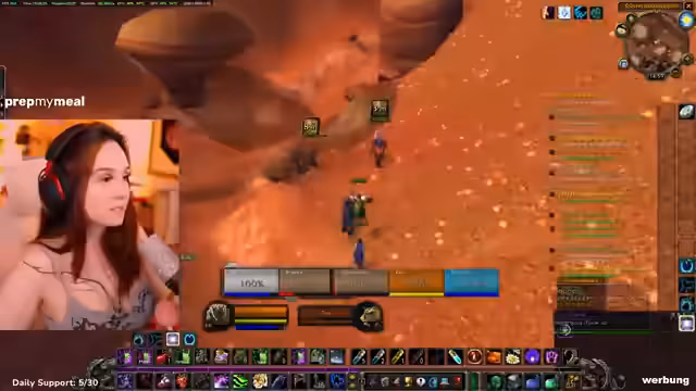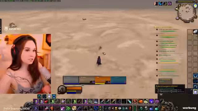 04:52:21Die Streamerin erkundet als Allianzcharakter ein Gebiet und stellt fest, dass es sich um eine Hordenzone handelt, in der manche NPCs nicht angreifbar sind. Sie trifft auf ihre Gruppe, bestehend aus zwei Level-33-Kriegern und sich selbst, und plant, eine Quest zu starten. Dabei wird über die Verteilung der Tank-Rolle gesprochen und ein Bannen von Gildenmitgliedern ohne korrekte Ausrüstung erwähnt.