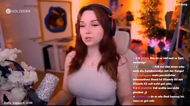01:05:12Feli erklärt die Einnahme von Vitamin D3 mit K2 zur besseren Aufnahme und vergleicht Kingdom Hearts mit Final Fantasy im Disney-Universum. Sie äußert hohe Erwartungen an das Spiel, da es von einem Zuschauer gewünscht wurde, erwähnt aber gleichzeitig ihre früheren Frustrationserfahrungen mit Kingdom Hearts auf dem DS, wo sie an einem Boss scheiterte und das Spiel nie beendete. Dies verdeutlicht ihre gemischten Gefühle bezüglich des heutigen Spielverlaufs.