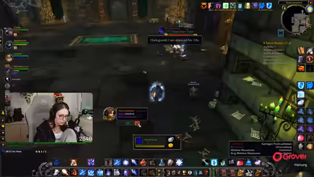 06:28:55Bei einem Run durch 'Scholomance' wird die Taktik gegen den Elitemob 'Teakix' besprochen. Der Streamer wird gesilenced und kann daher nicht als Tank agieren, was die Rolle von Niki als Haupttank zementiert. Die Gruppe muss darauf achten, nicht in den 'Chat' eines rivalisierenden Gildenführers zu schauen, um nicht provoziert zu werden. Es wird auch die überlegene Rolle des Schurken in bestimmten Situationen betont.