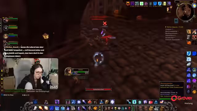 00:28:01Ein positives Highlight des Streams ist das Erreichen von Level 60 durch das Gildenmitglied Masat, das nach einem Rückschlag erfolgreich durchgespielt hat. Der Streamer möchte seine Waffe, den Kreuzfahrer-Titel, verzaubern benötigt dafür jedoch eine fehlende Zutat, die Arcanitrute. Aufgrund fehlender Gildenmitglieder, die Schmied sind, beschließt er vorerst, in der Sengenden Fickschlucht Spinnenfleisch für die Koch-Skillung zu farmen.