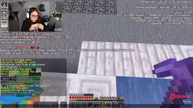 13:59:34Es wird über die Schwierigkeit des Baus von 'Zyran' gesprochen, welches als sehr nervig beschrieben wird. Es wird festgestellt, dass nur sehr wenig weißes Glas benötigt wird, aber mehr hellblaues Glas. Die Planung des Baus beginnt von oben, wobei der Streamer bereits seine Unlust über die Verwendung von dunkelblauem Glas äußert. Es wird erwähnt, dass am nächsten Tag ein Brunch mit der Familie stattfindet und ein Besuch bei Romy geplant ist. Der Streamer bedankt sich bei Ozuna für den Raid und erkundigt sich nach den Aktivitäten in Ozunas Stream, insbesondere nach einer 'Win-Challenge'. Es wird nach 'Prismarine Bricks' gefragt, die jedoch nicht verfügbar sind. Der Streamer äußert den Wunsch, noch etwas im Bau der Basis voranzukommen, da bisher nicht viel erreicht wurde.