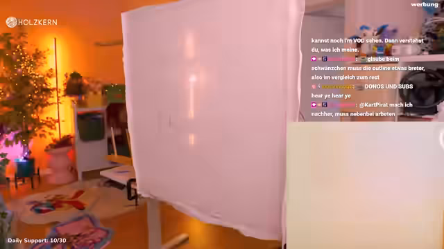 02:56:58Text-to-Speech wird wieder deaktiviert, da Julia bald zum Stream hinzukommt. Der Opspot wird so positioniert, dass er gut zugeschnitten werden kann, und der Chat wird darüber platziert. Der Streamer entschuldigt sich für die vorübergehende Stummschaltung des Chats. Es werden die benötigten Werkzeuge wie Stäbe und Einfädeler bereitgelegt und die Tufting Gun angeschlossen. Der Streamer fügt Julia als Freundin auf Discord hinzu und sendet ihr eine Anfrage. Es wird über die Musikauswahl im Stream gesprochen und ein 80er, 90er, 2000er Banger-Mix erwähnt. Ein Zuschauer merkt an, dass die Outline beim Schwänzchen dicker sein sollte, was der Streamer zur Kenntnis nimmt.