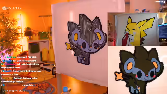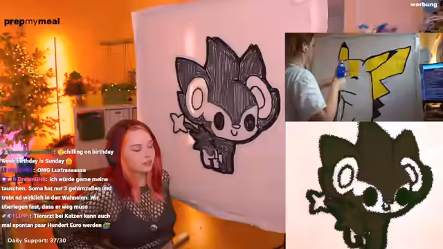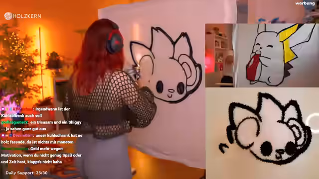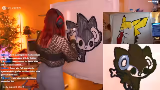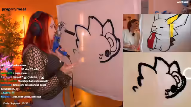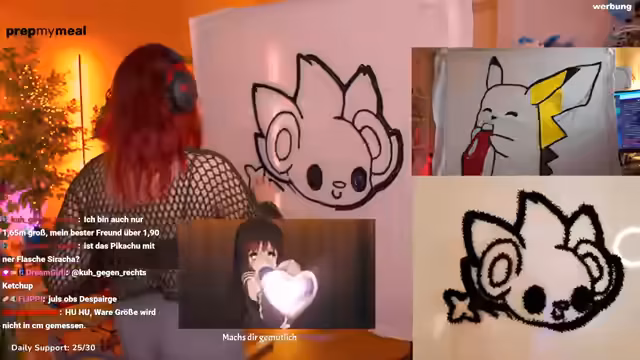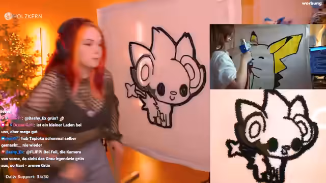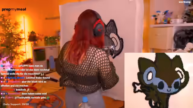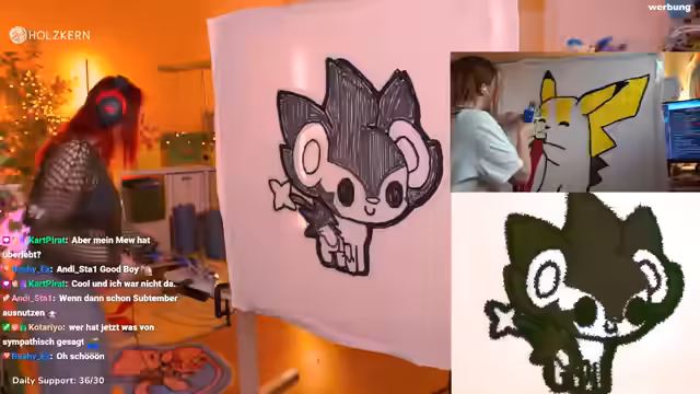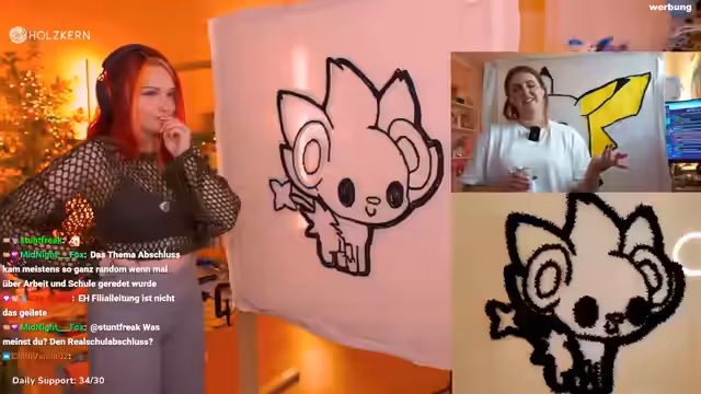 02:02:45Es wird eine Anekdote von der Connichi erzählt, wo der Streamer und Riku aufgrund ihres jugendlichen Aussehens mehrfach nach ihren Ausweisen gefragt wurden, selbst in Onsies. Der Grund für die Altersbeschränkung war ein AMV mit anzüglichem Inhalt. Im Anschluss werden Vorbereitungen für das Live-Zeichnen getroffen, inklusive dem Herausholen eines Stuhls und dem Installieren des Obsebots. Der Mew-Teppich wird gelobt und ein Tisch zum Aufzeichnen bereitgestellt. Es wird erwähnt, dass die Zusammenarbeit mit Dream Girlie online stattfindet. Ein Problem mit einer stumpfen Schere und zu wenig Tuftingstoff wird thematisiert, was den Streamer frustriert. Ein Affiliate-Link für Tufting-Materialien wird erwähnt.