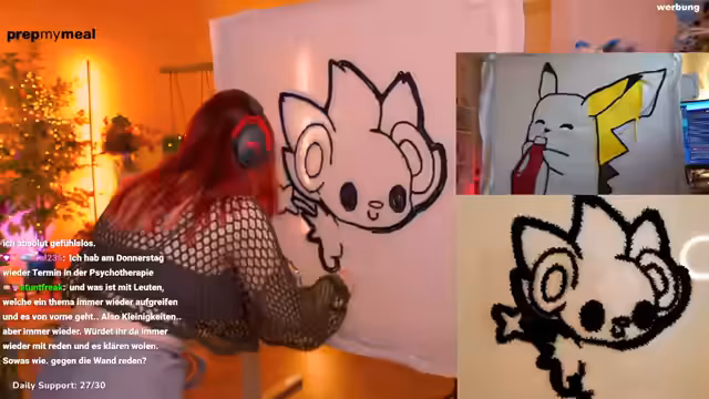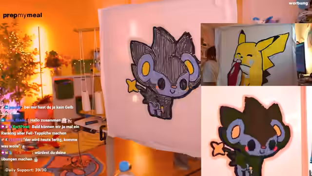01:04:44Es wird eine kurze Vorstellung für neue Zuschauer gemacht, bei der Feli ihr Alter (27) erwähnt, wobei betont wird, dass sie jünger aussieht. Im Stream gibt es viel Kreatives, wie den selbstgemachten Mew-Teppich, der im Stream rasiert wurde. Es werden Cosplays gemacht, Teppiche getuftet und Gaming betrieben, hauptsächlich Simulatoren und Storygames. Feli singt auch, spielt League of Legends und macht IRL-Streams sowie Trading-Card-Content mit Box-Breaks. Sie erwähnt ihre Katze Chonk, die während des Teppichmachens ausgesperrt wird, um sie vor der scharfen Tufting Gun zu schützen. Der Tierschutzkater Chonk ist aus Bulgarien und wurde über Ebay Kleinanzeigen gefunden, wo sie sich in ihn verliebte. Er ist bekannt auf Twitch und oft in Twitch Clips Germany zu sehen. Die Tuftingpistole wird als das Werkzeug zum Teppichmachen erklärt. Das Setup wurde umgebaut, um mehr Platz zu schaffen und entspannter streamen zu können. Gestern wurden der Teppich rasiert und geleimt, Karten geschrieben und eingepackt sowie das Setup umgebaut, was den Tag sehr produktiv machte.