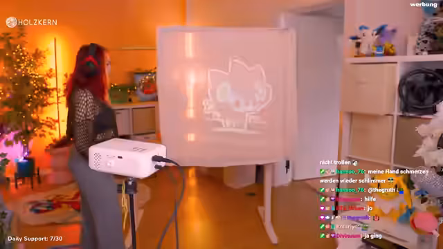 02:16:19Es werden weitere technische Schwierigkeiten beim Aufbau des Beamers geschildert, insbesondere das Fehlen des Stromkabels, welches kurzerhand vom Apple TV "geklaut" wird. Der Streamer schildert humorvoll das chaotische Vorgehen. Es wird ein Kommentar über den Inhalt des Streams gemacht, während das Luxra-Bild vorbereitet wird. Der Streamer geht kurz auf Toilette und ist danach wieder da und es wird das Bild für das Tufting-Projekt scharf gestellt und ausgerichtet. Es wird Text-to-Speech kurz aktiviert, aber dann wieder deaktiviert, da Julia bald zum Stream hinzukommt. Dream Girlies Wunsch nach einem Lux-Traf-Teppich, der beim Poké-Son gewonnen wurde, wird erwähnt. Es wird die Frage geklärt, ob der Teppich gespiegelt sein soll oder nicht, und entschieden, dass es so passt.
