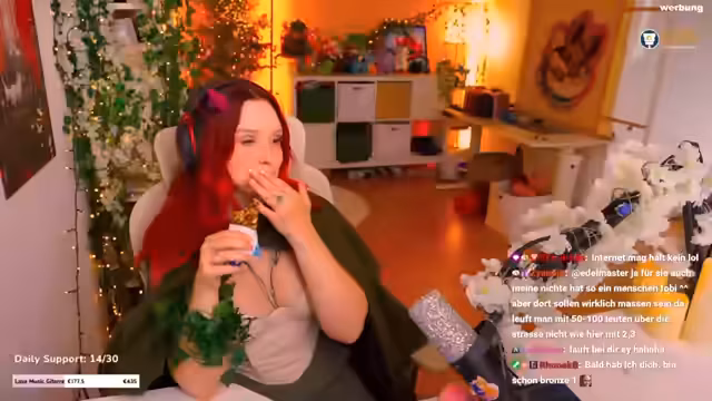 01:20:25Ein Hauptthema ist die Unzufriedenheit mit der eigenen Wohnsituation. Der Streamer fühlt sich in ihrer Wohnung zu eingeschränkt für ihre kreative Arbeit, insbesondere für Cosplay. Sie wünscht sich ein größeres Zuhause mit einem eigenen Atelier und einer größeren Küche, um Kochstreams zu machen. Dies sei auch ein Grund für den Wunsch, in Frankfurt umzuziehen. Zudem berichtet sie von ihrer Angst vor Dämonen in Häusern, die darin begründet ist, dass sich jemand in einer Wohnung schneller gemeldet hätte.