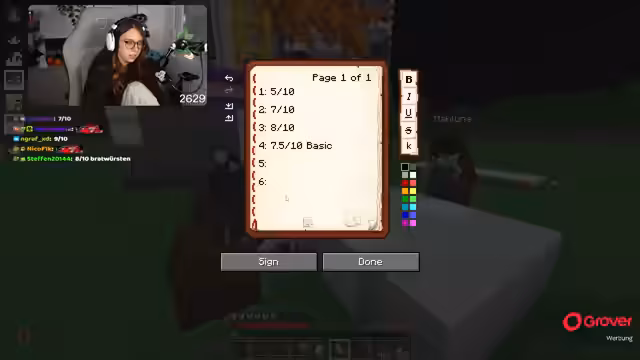 12:42:37Nachdem die erste Schätzung von 4 von 10 falsch war, wurde eine neue Frage gestellt: ein Essen, das in der Mikrowelle aufgewärmt wird, wie ein Braten vom Vortag, bei dem aber einzelne Teile kalt bleiben. Dies führte zu einer Schätzung von 6 von 10. Die nächste Frage drehte sich um einen Craft-Attack-Regelverstoß, genauer gesagt das Duplizieren von Baublöcken für die eigene Base. Die Spieler diskutierten, wie schwerwiegend dieser Verstoß auf einer Skala von 1 bis 10 einzuschätzen sei, wobei 1 für harmlos und 10 für extrem schlimm steht. Nach Überlegung und dem Hinweis, dass es um unendlich viele Baublöcke ging, wurde die Zahl 7 als Lösung genannt und bestätigt. Die Schwierigkeit des Spiels wurde hervorgehoben.