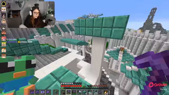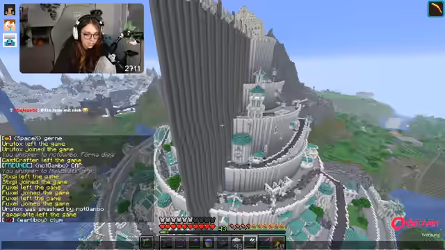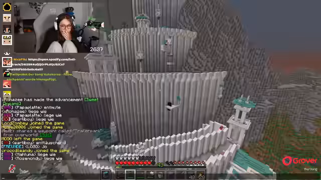 12:47:45Es wurde über den Baufortschritt an der Brücke gesprochen, wobei die Spieler die Ästhetik und den „heftigen Progress“ lobten. Es gab Vorschläge für weitere Details, wie Begrünung und Verzierungen. Die Idee, Lampen oder Amor-Stands mit Schwertern auf den Säulen der Brücke zu platzieren, wurde diskutiert, um die „Herr der Ringe Lore“ zu ergänzen. Poco wurde gebeten, sechs Mini-Statuen oder Armour-Stands mit Posen zu bauen. Es wurde auch die Möglichkeit erwähnt, dass unterschiedliche Gars (Flugobjekte) unterschiedlich schnell sein könnten, je nach Verzauberung. Die Spieler arbeiteten zusammen, um Quarz zu sammeln und zu traden, da ein „extremer Tiefstand“ an diesem Material herrschte. Die Raidfarm wurde als weitere Quelle für Emeralds in Betracht gezogen.