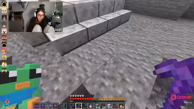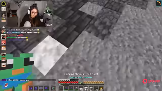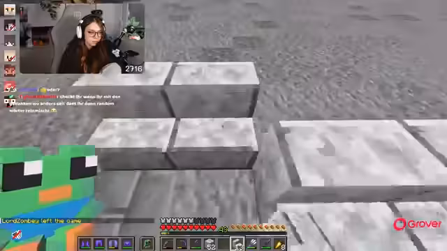 02:48:11Felica erleidet ihren ersten Tod im Spiel durch einen Zombie, was ihr sehr peinlich ist, da sie AFK war, um Wäsche zu machen. Sie wird von Heiko angerufen, der sie über ihren Tod informiert und ihr anbietet, ihre Sachen zurückzugeben. Es kommt zu einer humorvollen Verhandlung, bei der Felica ihre Sachen im Austausch für 20 Subs für ihr gebautes Haus zurückbekommen soll. Dieser 'Deal' wird von ihr als schlecht empfunden, aber sie muss ihn annehmen. Später stellt sich heraus, dass die Namen ihrer Werkzeuge, wie 'Safti' für ihre Schaufel und 'Fickerig' für ihre Elytra, auf Chat-Namen basieren, was als 'parasozial' und 'verrückt' bezeichnet wird. Felica ist frustriert über ihren Tod, der durch eine alltägliche Aufgabe verursacht wurde, und bedauert, dass sie Torbens Wäsche gemacht hat.