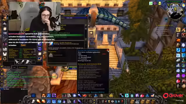 05:44:26Ein Großteil des Gesprächs dreht sich um die Verwaltung von Gold innerhalb der Gilde für den Raid. Die Sprecherin plant, einen erheblichen Teil ihres Goldes (über 500) an die Gilde weiterzuleiten, da die Preise im Auktionshaus angeblich verfünffacht sind. Es wird ein Vorschlag diskutiert, dass Simon Gold erhält, um im Namen der Gilde Materialien zu kaufen. Ein großes Problem ist die Beschränkung, keine Gegenstände von anderen Raid-Mitgliedern annehmen zu dürfen, da diese ebenfalls das Gilde-Haus nutzen. Der Deal, dass Simon nach dem Raid die Materialien entzaubert, wird als Lösung vorgeschlagen.