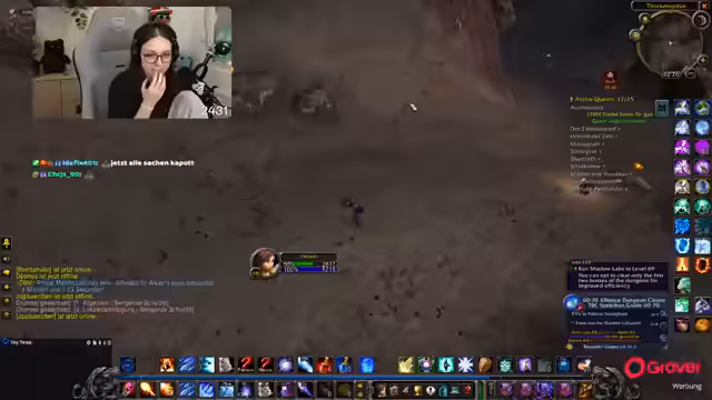 08:20:45Es erfolgt eine Abstimmung über den aktuellen Stand des Elementarfeuer-Farmings. Letzter Stand waren 321 benötigte Feuerelemente, von denen heute bereits einige von den Spielern gefarmt wurden, aber der Streamer ist unzufriedener mit der Geschwindigkeit des Drops. Es wird der Bedarf an weiterem koordinierten Farmen betont, um die Anforderungen für den Raid von morgen zu erfüllen und den Ausfall des Raids zu verhindern.