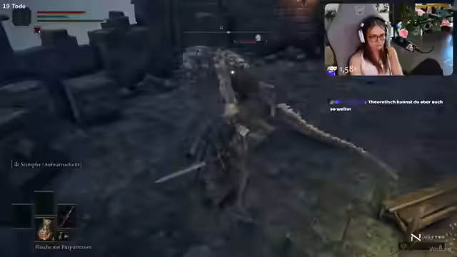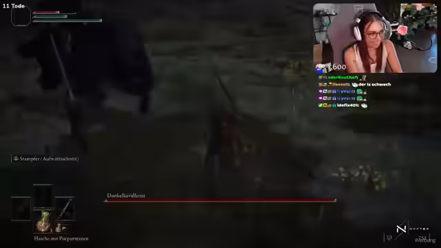 01:56:08Der Streamer erkundet ein gruseliges Gebiet und trifft auf mehrere starke Gegner, darunter einen ominösen "Atze", dem er ausweichen möchte. Er reist mit seinem Pferd durch das dunkel anmutende Gelände, um eine "Gnade" zu finden, die ihm das Wiederbeleben nach dem Tod erleichtern würde, und dabei spawnen kontinuierlich neue Gegner auf. Er verliert währenddessen seine gesammelten Seelen, als er im Kampf stirbt, was ihn frustriert und verärgert.