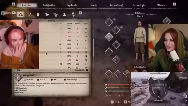 03:28:04Es wird festgestellt, dass Frühling ist und Steuern gezahlt werden müssen. Es wird festgestellt, dass nicht genügend Geld vorhanden ist und überlegt, wie man schnell an Geld kommen kann. Die Idee, den Händlerkarren zu suchen, wird in den Raum geworfen. Es wird versucht, Birkensetzlinge und Pelz zu verkaufen, aber das bringt nicht genug Geld ein. Es wird überlegt, ob man stehlen muss. Es werden Kaninchen-Quests angenommen, um Geld zu verdienen. Dilly soll ihr Geld geben, um die Steuern zu bezahlen. Es wird Temperaturtoleranz gelevelt. Es wird eine Kaninchenjagd gestartet, um die Quests zu erfüllen. Es wird überlegt, Video Ninja zu verwenden, um das Spiel des anderen aufzuzeichnen, um Performance-Probleme zu vermeiden. Die Frage, wo der Karren zu finden ist, wird aufgeworfen und es wird überlegt, ob es einen Brief von ihm gibt. Es wird festgestellt, dass es keine zusätzlichen Hinweise gibt und dass man die Steuern zahlen muss. Es werden Blümchen gefunden und überlegt, diese zu verkaufen. Es wird humorvoll überlegt, ob man den Steuerbeamten bestechen oder körperliche Dienste anbieten soll. Es wird über ein Vorsprechen für One Piece gesprochen und dass ein Bekannter genommen wurde. Es wird über die Gamescom gesprochen und dass Dilli Blackhammer kennt, der im GTA Joker spielt und eine krasse Stimme hat.