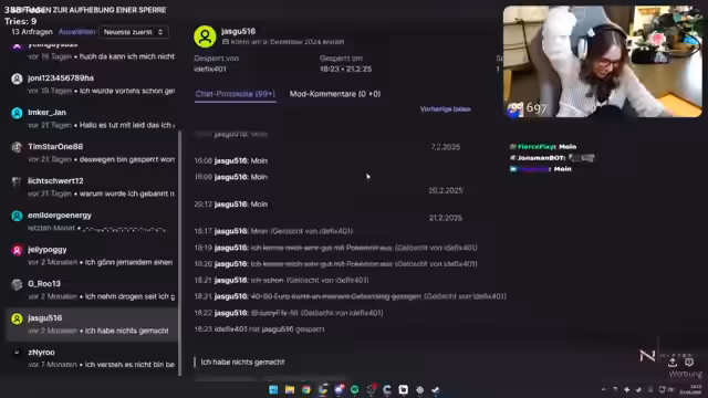 06:50:31Der Streamer liest einen Entbannungsantrag vor, in dem ein Chatter behauptet, der Streamer verdiene kein ehrliches Geld. Der Streamer verteidigt sich und erklärt, dass er nicht geldgierig ist und das Raumexperiment nur zum Spaß gemacht hat. Er findet die Kommentare peinlich, gibt aber zu, dass er manchmal blöde Sachen sagt.