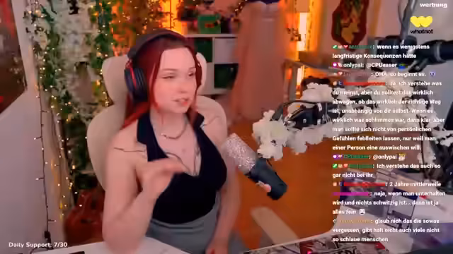 Es wurde über persönliche Unsicherheiten und berufliche Hintergründe gesprochen. Feli sprach über ihre Vergangenheit als Fotografin und kritisierte unbezahlte Praktika, während sie gleichzeitig ASMR-Geräusche und Gaming-Tastaturen thematisierte. Sie reflektierte über Beziehungen und bat die Community um Meinung zu hypothetischen Rollenbildern. Es wurde auch über ihre Fitness und den Traum vom Marathon-Lauf in Neuseeland gesprochen.