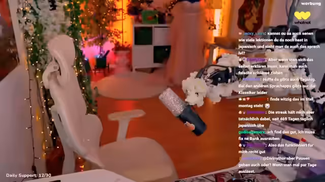 03:34:18Zu Beginn des Streams widmet sich feli einer japanischen Sprachlektion. Er interagiert intensiv mit dem Chat und probiert neue Vokabeln aus, darunter Gyuniu, Kohi, Pan, Otokonohito, Onnanokoto und Sandwichito. Dabei lernt er Begriffe wie Reis (Gohan), Mann (Otoko no Hito), Frau (Onnanokoto), Hund (Inu) und Katze (Neko) in verschiedenen Kontexten. Er erwähnt, dass er täglich eine Lektion machen möchte, um im September nach Japan zu reisen und stellt die von ihm genutzte Lernapp Rosetta Stone vor.