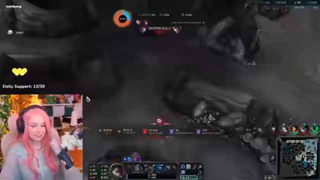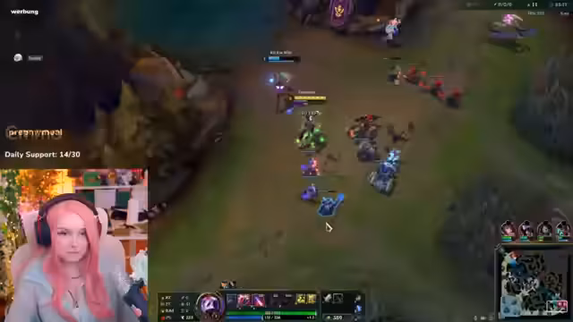 04:19:54Das Spiel neigt sich dem Ende zu und für den Streamer sieht es düster aus. Er hat nach 11 Minuten nur 53 Gold-Farm, was sich als zu wenig erweist, um relevanten Schaden zu machen. Obwohl er die schwierige Lage erkennt, unternimmt er noch einen letzten Versuch, in den Kampf einzugreifen, wird aber von der gegnerischen Katharina sofort eliminiert. Der Stream endet mit dem Gefühl, ausgespielt worden zu sein und als 'ADC-Leutscher' gescheitert zu sein.