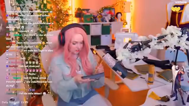 00:09:58Die Diskussion um die rosa Perücke und den Wunsch nach langem, buntem Haaren setzt sich fort. Der Streamer gibt zu, dass seine eigenen Haare zu kaputt für eine solche Farbe sind. Aus diesem Grund nutzt er High-Quality-Perücken von der Seite Wick is Fashion oder Amazon. Das Outfit des Tages, ein japanisches Top mit einem Schlitz, wird als süß und cutesy gelobt. Die Farben der Kleidung werden als pastellig beschrieben. Ein Perlenlippenstift wird als lästig empfunden, weil er ins Gesicht läuft. Die Zuschauer interagieren intensiv, indem sie das Outfit und die Perücke bewundern.