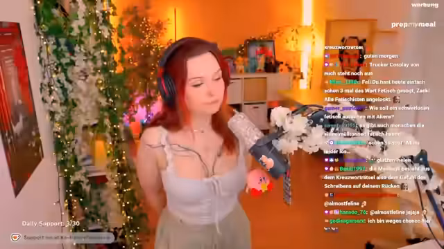 00:28:00Ein plötzlicher Themenwechsel führt zu einer Diskussion über ungewöhnliche Fetische. Ausgelöst durch eine wiederholte Frage eines Chat-Teilnehmers nach Streaming in Schwerelosigkeit, entwickelt sich ein Gespräch über die Vielfalt an Vorlieben im Internet. Streamer feli listet verschiedene Beispiele auf, von Fuß- bis hin zu Möbelstücken-Fetischen, und stellt die Grenzen des Vanilla-Sex infrage. Der Chat reagiert mit einem Mix aus Schock, Neugier und humorvollen Kommentaren.