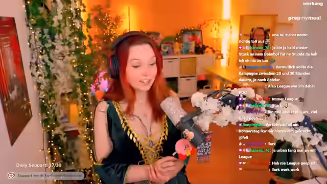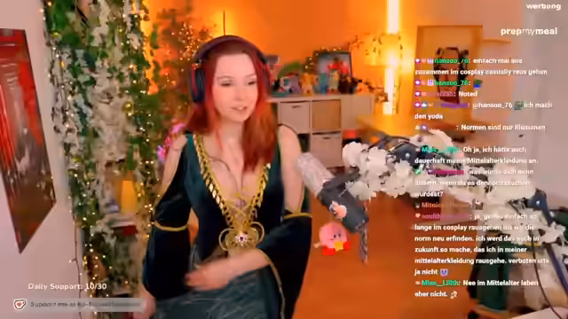 01:17:32Der Fokus verschiebt sich zum Auspacken und Anprobieren eines neuen Triss-Cosplays. Der Streamerin ist aufgefallen, dass der Stoff über den Schultern rutscht und sie sucht nach einer Lösung, wie sie es sicher anbringen kann. Nachdem das Outfit schließlich mit einem Sicherheitsnadel fixiert ist, zeigt sie es im Stream, fühlt sich darin hübsch und wünschte, sie könnte es im Alltag tragen. Die Verarbeitung und das Design werden als hochwertig gelobt.