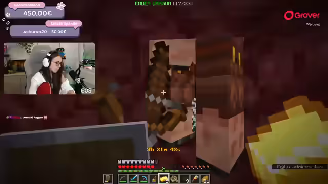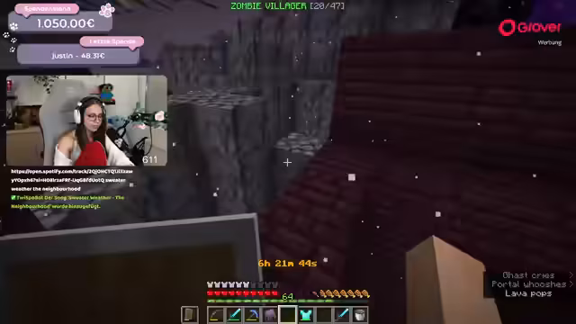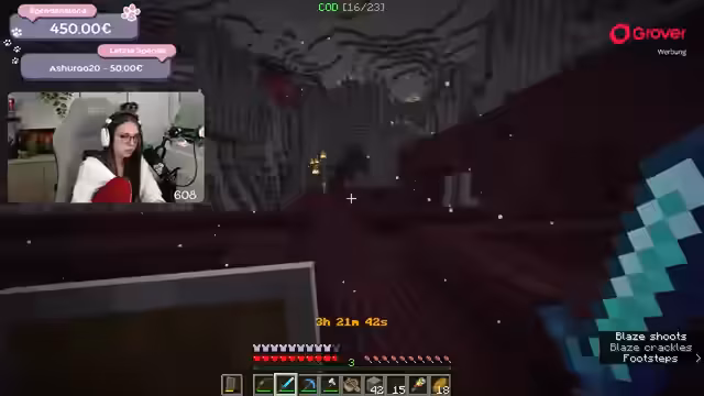 03:17:04Die Spenden nehmen zu, was zu einer Aufspaltung der Herausforderung führt. Eine 50-Euro-Spende von 'Aschura' bedeutet, dass zwei zusätzliche Mobs gefunden werden müssen. Der Streamer entschließt sich, ins Nether zu reisen, um dort weiteres Erz und Ressourcen zu farmen. Dort trifft er auf eine Bastion, erfährt aber auch den ersten großen Rückschlag, als er in Lava fällt und stirbt, wobei einen Großteil seiner Ausrüstung verliert. Dies sorgt für Spannung und Action im Stream.